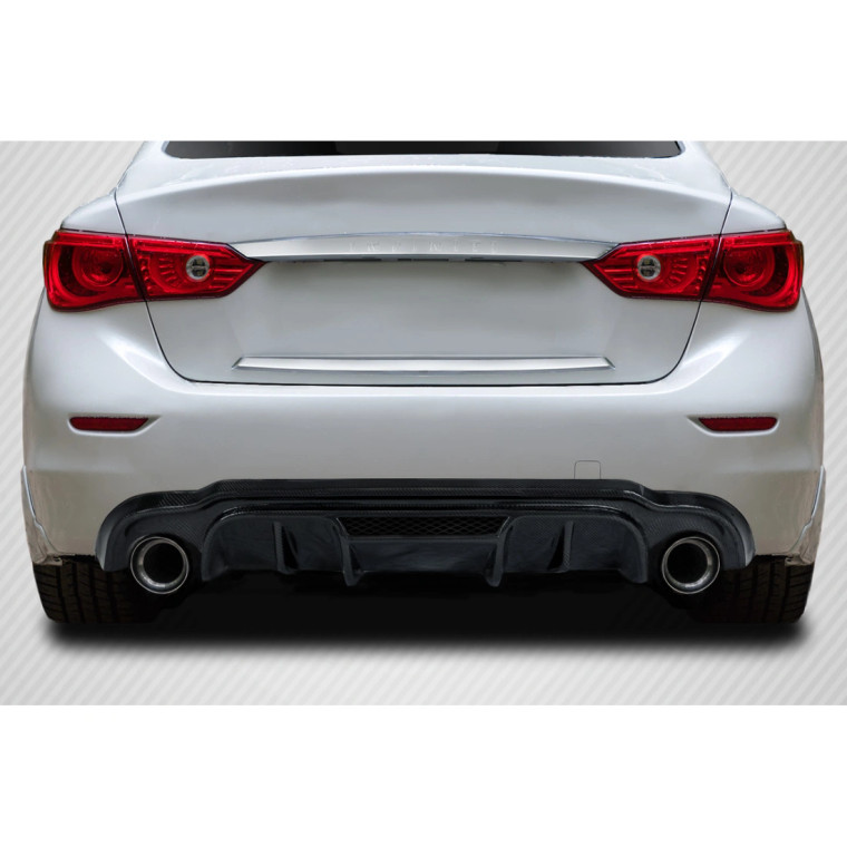 Introducing the Lightspeed Rear Diffuser(S) for the 2014-2017 Infiniti Q50, a perfect blend of style and performance from Carbon Creations. This custom Diffusers with proper installation is designed to enhance the aerodynamics of your vehicle, providing improved downforce and stability at high speeds depending on the design. Rarely seen on the street, the Lightspeed Rear Diffuser(S) is made from Carbon Fiber materials and offers a unique custom style.